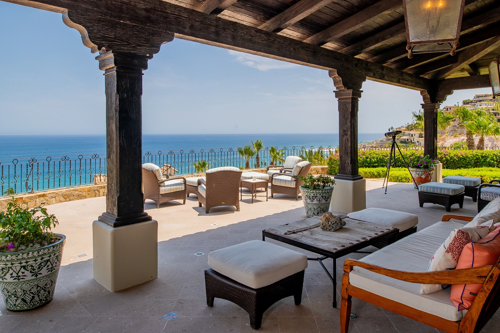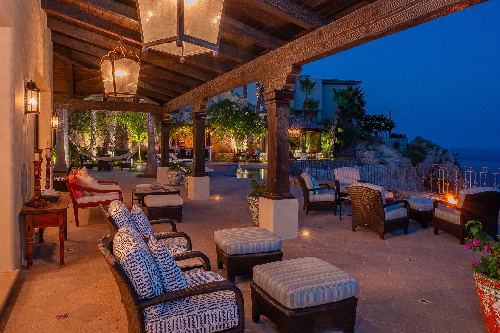 When you’re in the mood for outdoor luxury, you don’t have to go far to find it at Hacienda Del Mar. This property features a fantastic infinity pool and Jacuzzi combo surrounded by a pool deck dotted with plush loungers and chairs perfect for relaxation. Hacienda Del Mar is equipped with a collection of covered verandahs, ideal for savoring on extra-sunny days, and also hosts a fire pit to gather around under the stars in the evening. The outdoor dining area invites guests to enjoy alfresco meals while soaking in the ocean views and the tranquil ambiance.