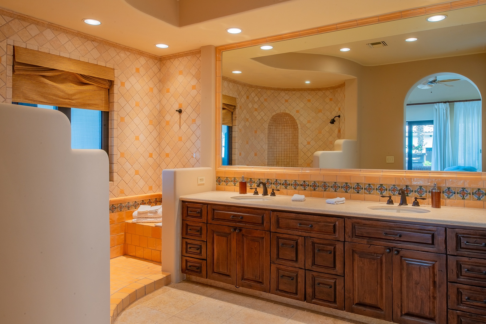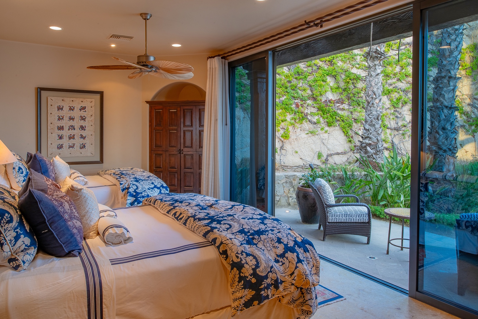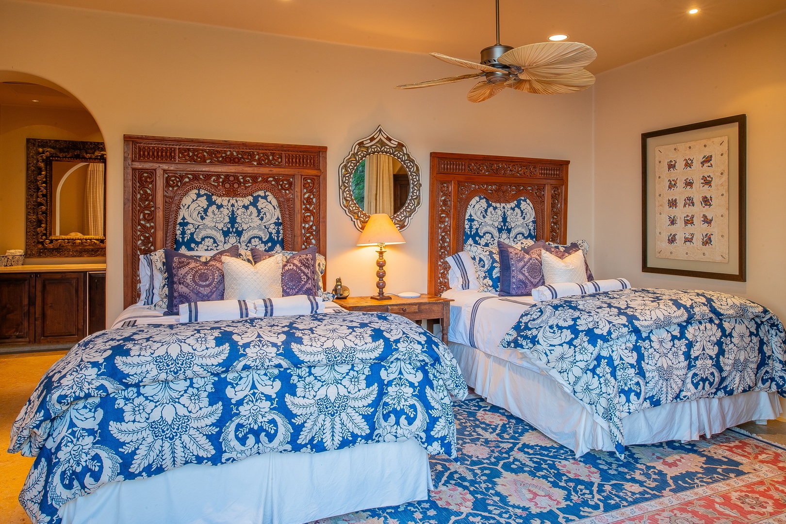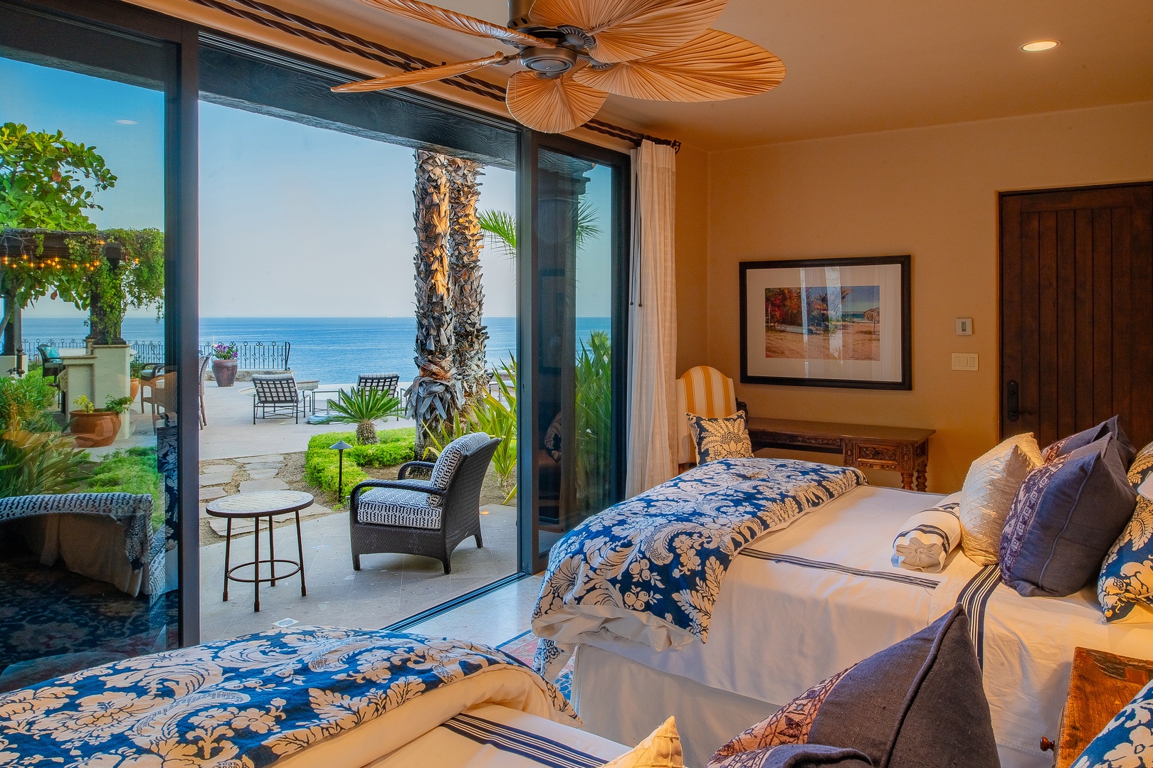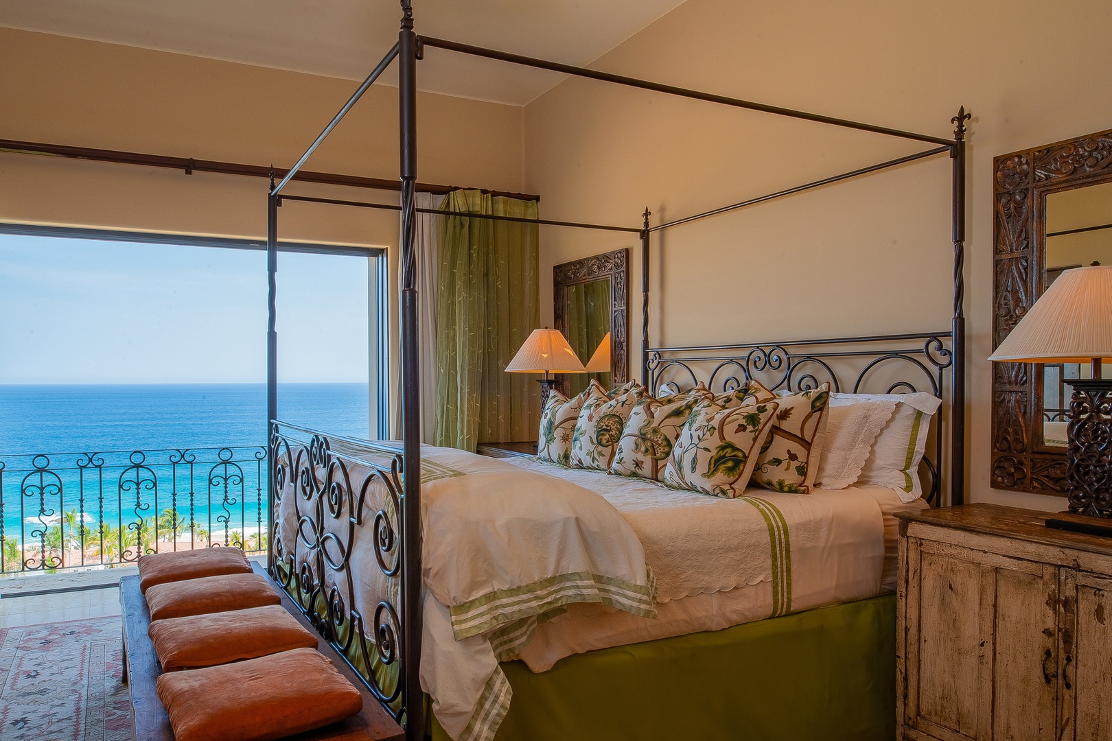 When it’s time to rest, every bedroom in Hacienda Del Mar is a serene retreat. Each bedroom offers access to the wrap-around terrace, providing guests with sublime sea views at any time of day. The bedrooms are decorated in rich jewel tones and feature plush mattresses topped with high-quality linens and comforters. En-suite bathrooms add an extra layer of convenience and luxury, ensuring that guests have everything they need for a comfortable and memorable stay.