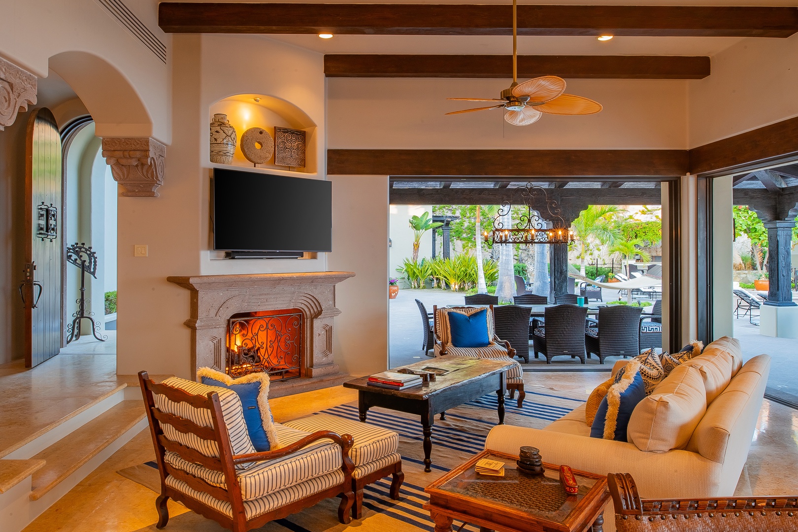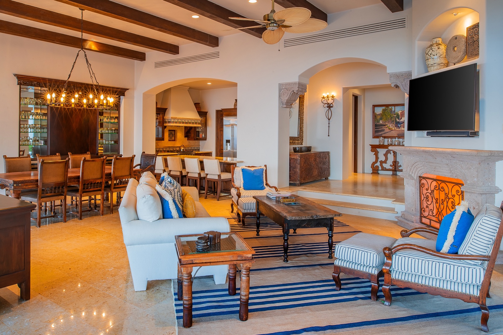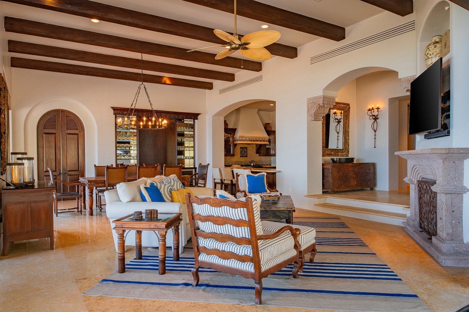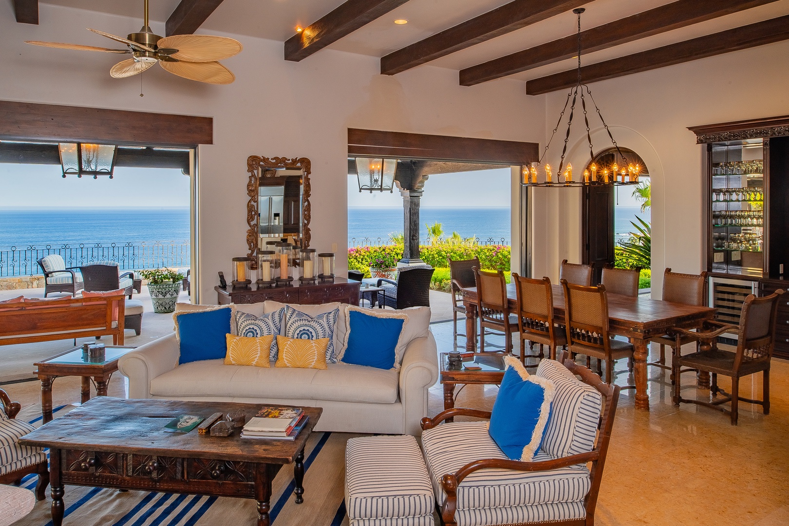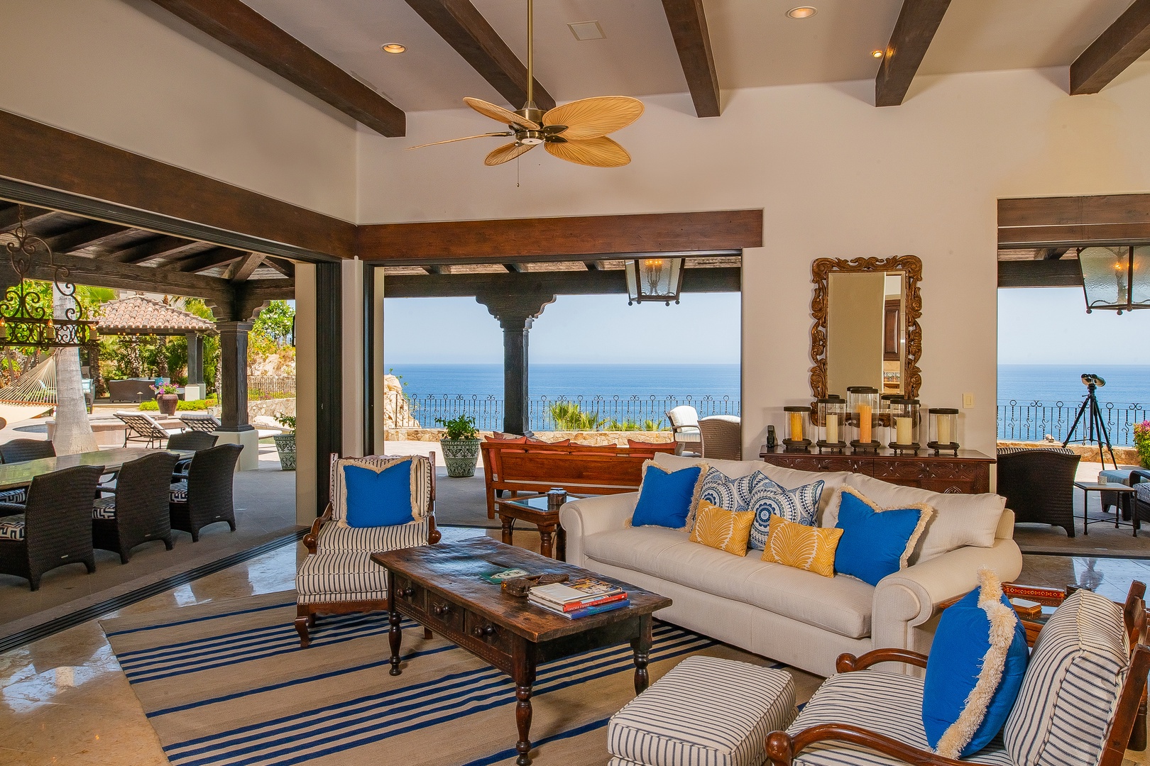 Whimsical color palettes, upscale amenities, and spacious surroundings are yours to enjoy when you step into Hacienda Del Mar. This bright and welcoming villa features an open floor plan paired with vaulted ceilings and floor-to-ceiling windows throughout, creating a seamless flow between indoor and outdoor living spaces. The living room is elegantly furnished with a plush white sofa and a peach-hued overstuffed armchair, both adorned with colorful Mexican-style throw pillows and settled around a glass coffee table. The bright red ottoman in front of the large flat-screen television adds a pop of color, while the bamboo blade fan overhead provides a delightful tropical touch.