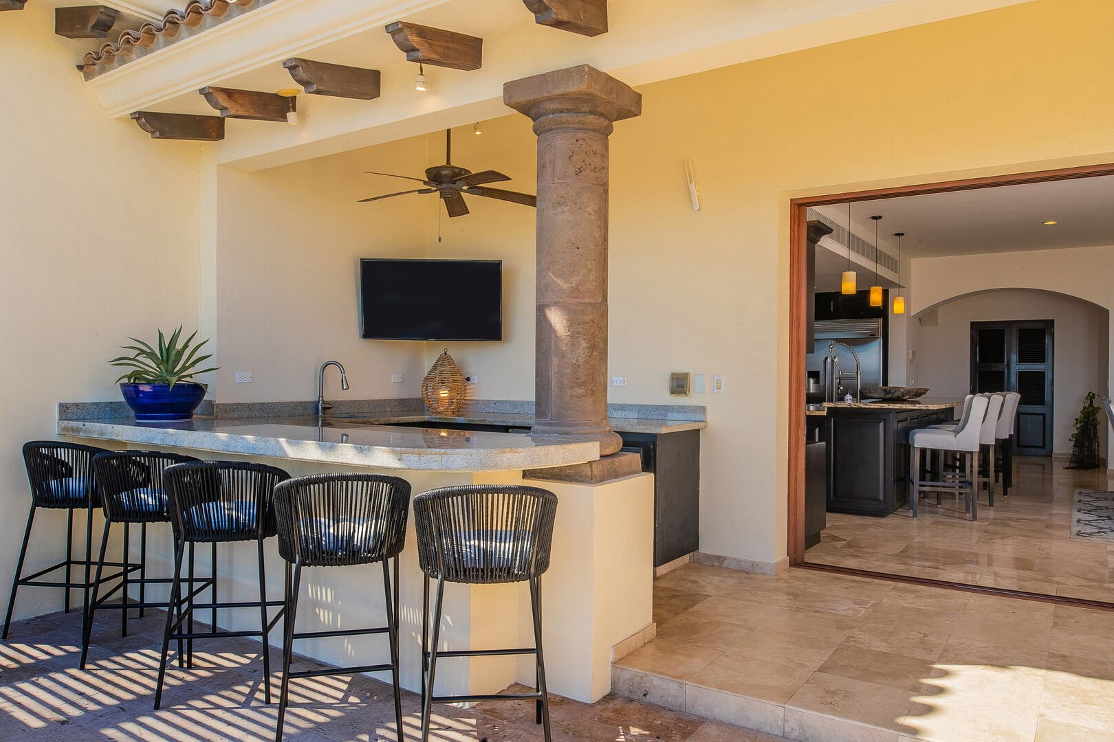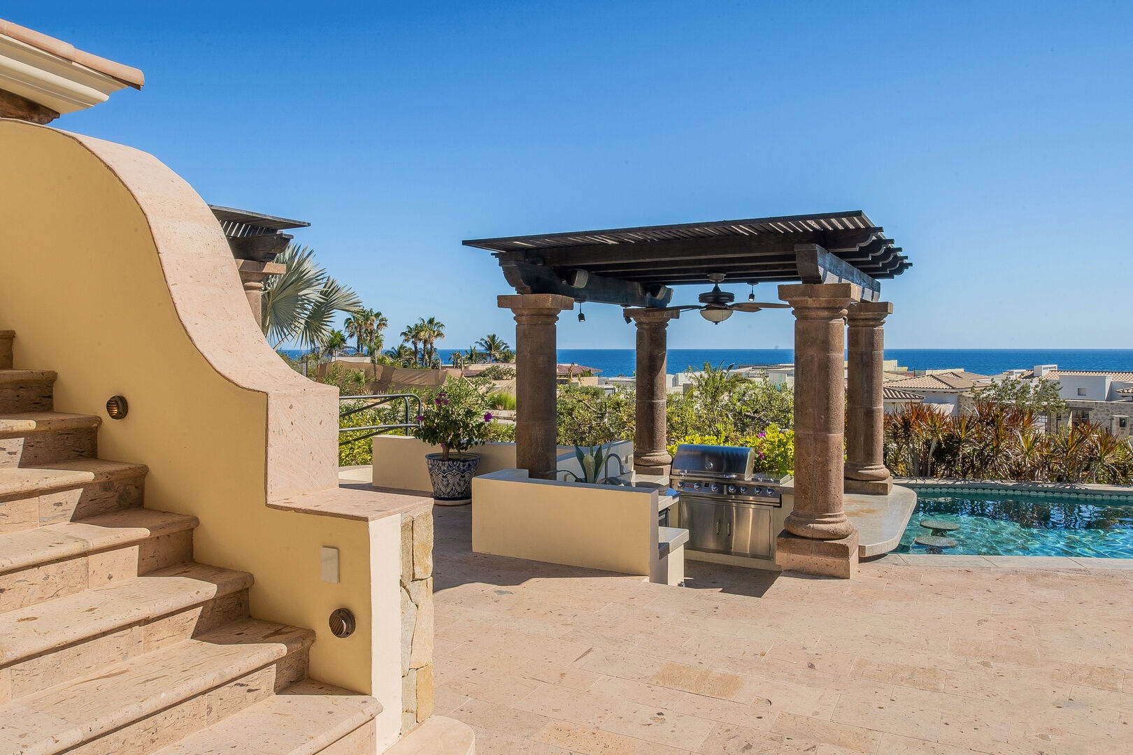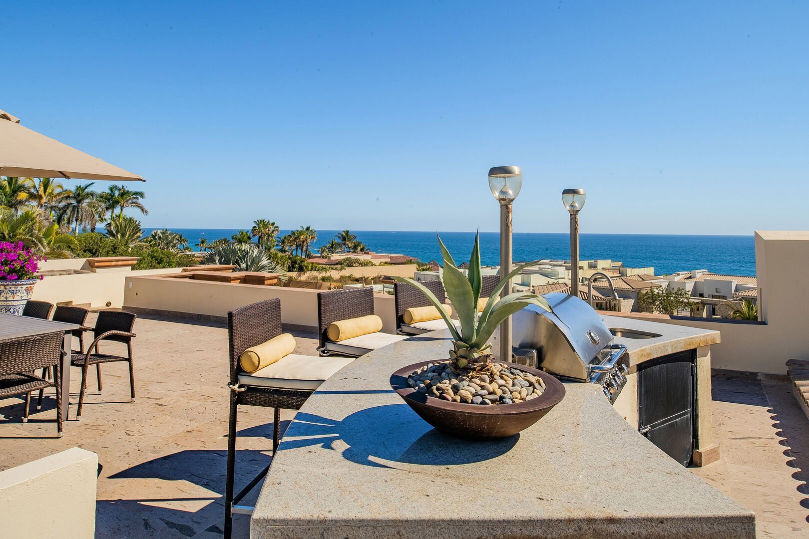 This 5-bedroom villa boasts white marble flooring, granite countertops, a media room, and attractive bedroom suites. The captivating décor is enhanced by tasteful designer touches and artwork throughout the home. Outside, guests can take a dip in the pool, complete with a swim-up bar, or head to the rooftop deck to enjoy the breathtaking views of the Sea of Cortez. In the evening, gather around the fire pit with loved ones and soak in the serene atmosphere. You may find yourself not wanting to leave this exceptional retreat.