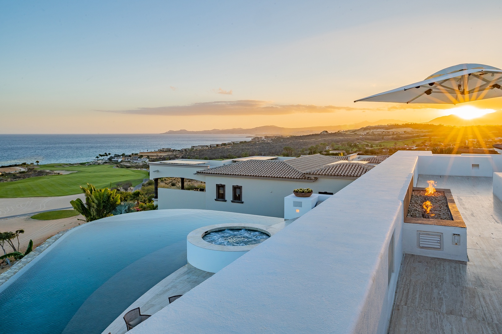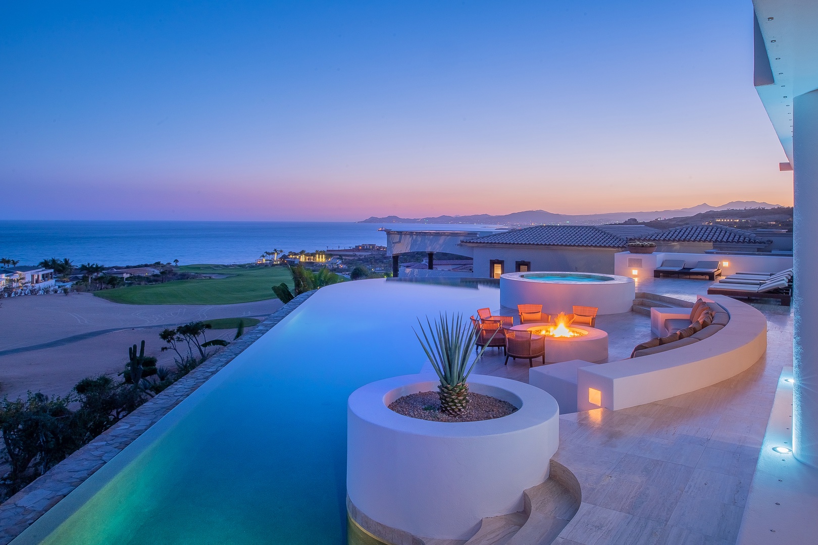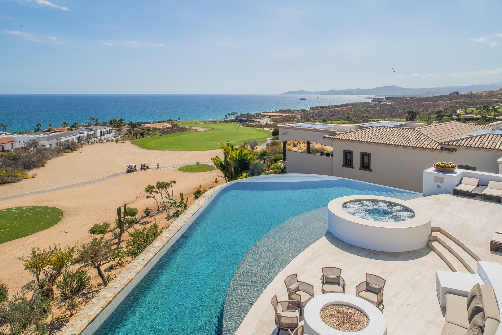 Villa Fundadores is a contemporary vacation home with clean lines, ideally located on the 7th fairway of the Jack Nicklaus golf course in Puerto Los Cabos. Offering stunning views of the golf course, ocean, and mountains, this luxurious retreat is within walking distance to the beach. The spacious open-plan design makes Villa Fundadores perfect for group trips or private getaways, featuring a full-service bar, expansive terraces, a heated infinity pool, and Jacuzzi. The home’s elevated position provides a bird's eye view of the surrounding area, enhancing the sense of tranquility and luxury.