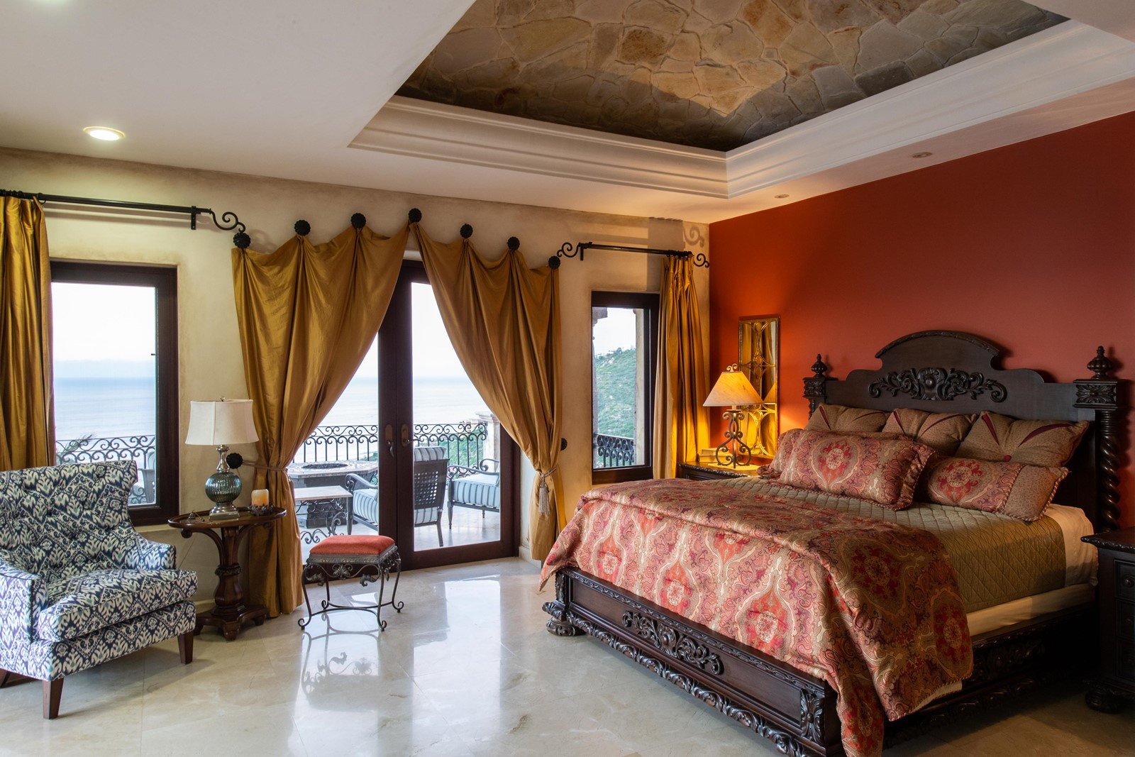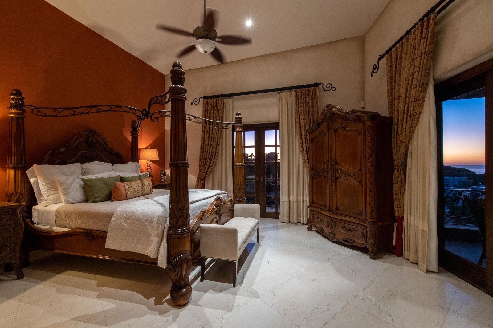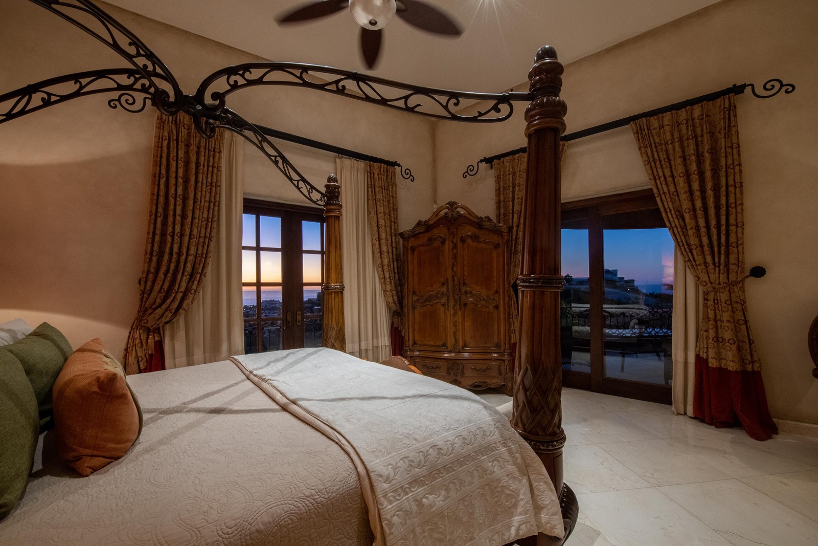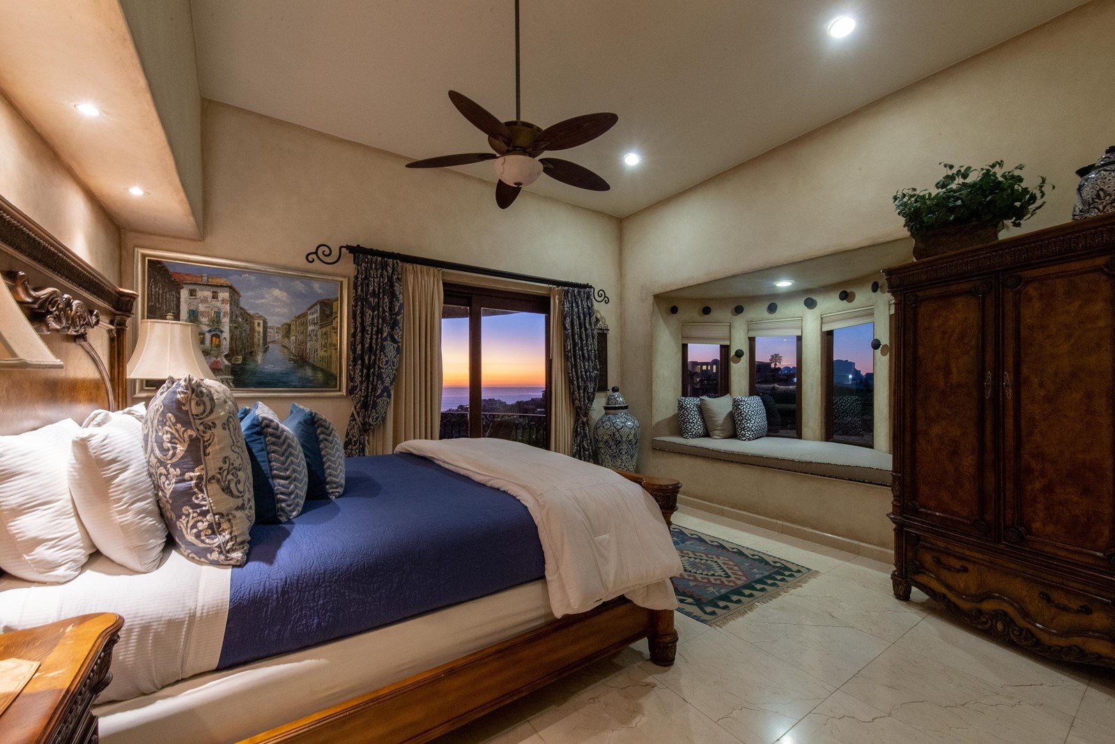 A bedroom in this Los Cabos villa with a view of the sunset over the ocean.
