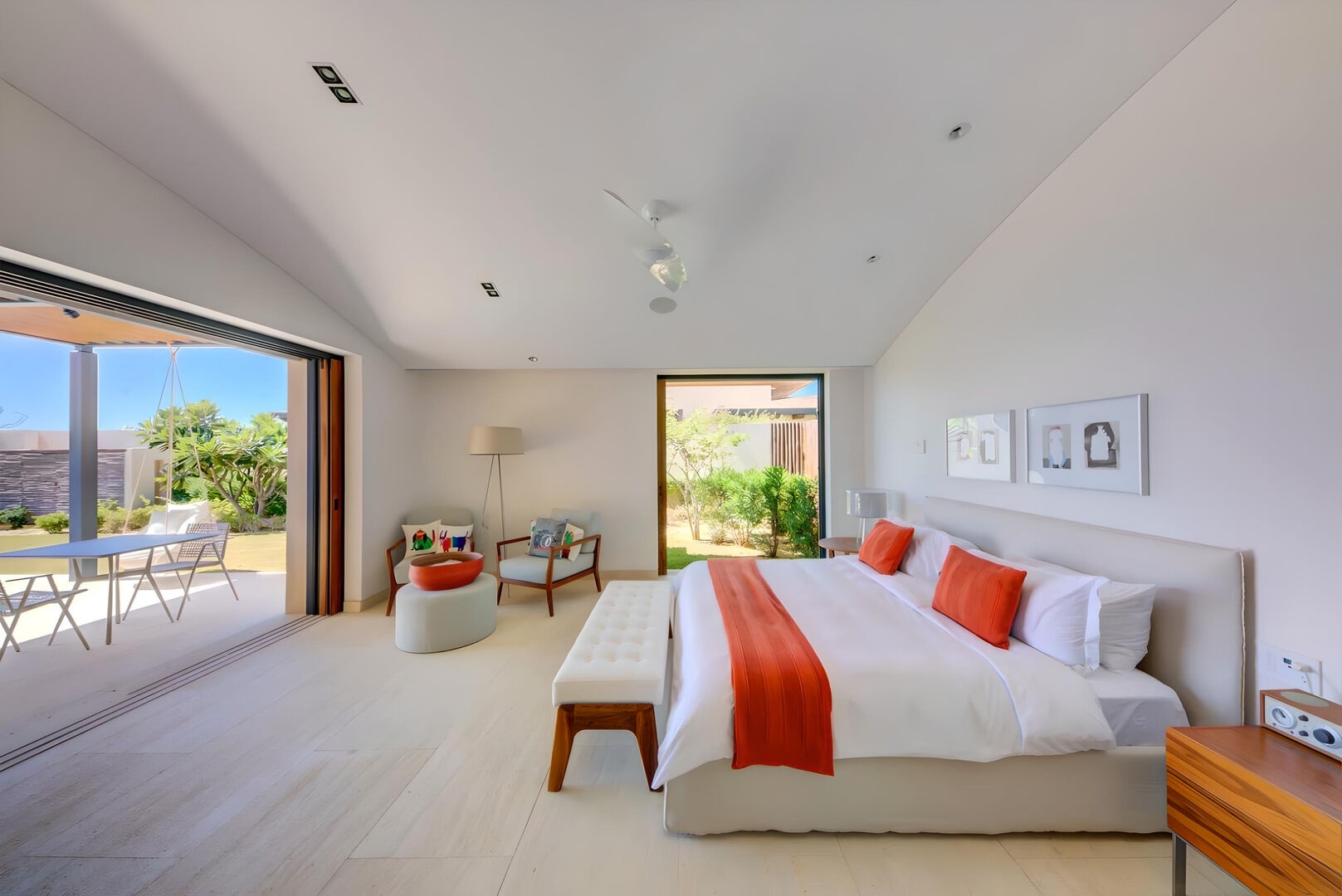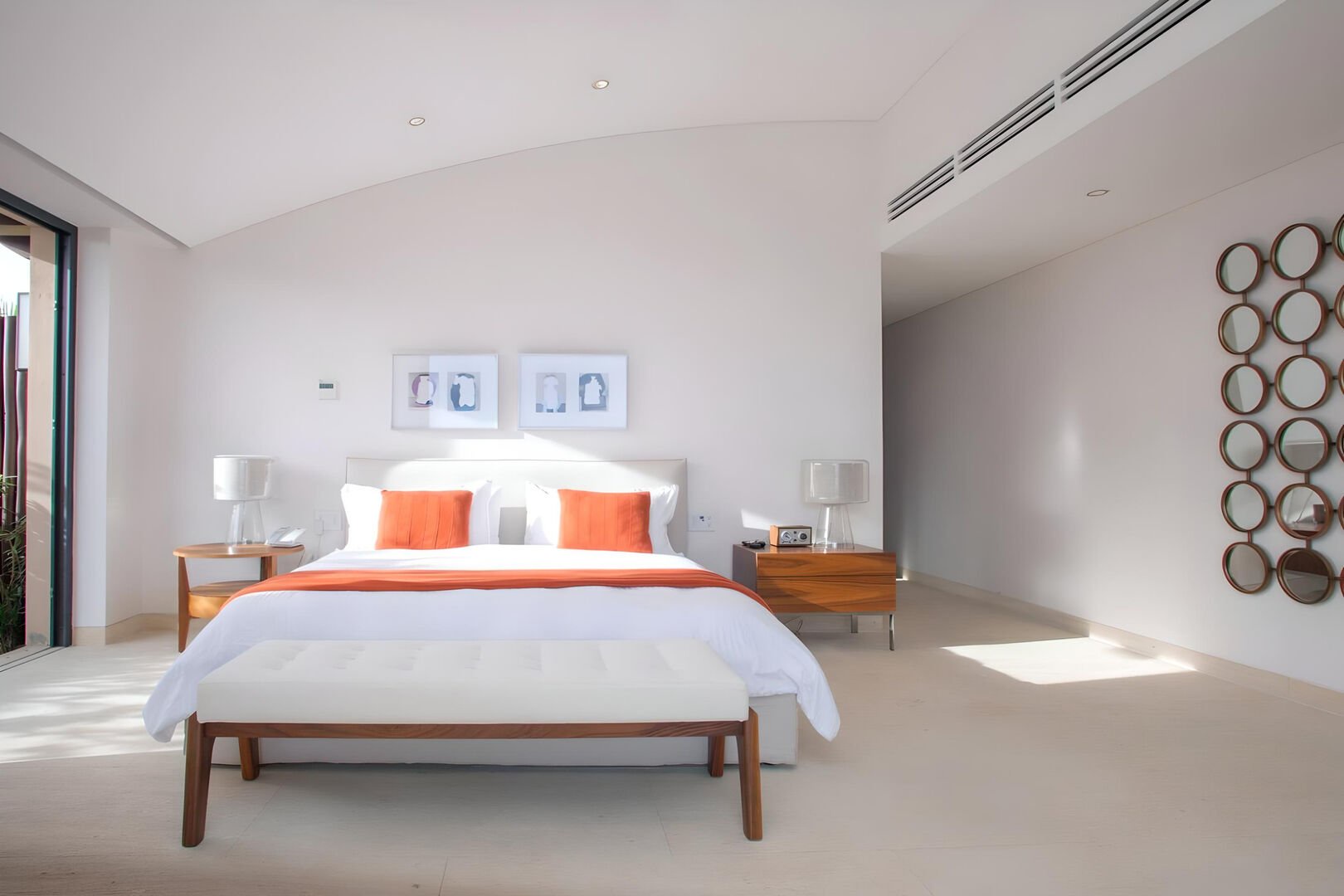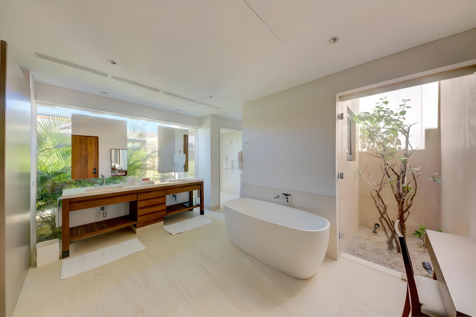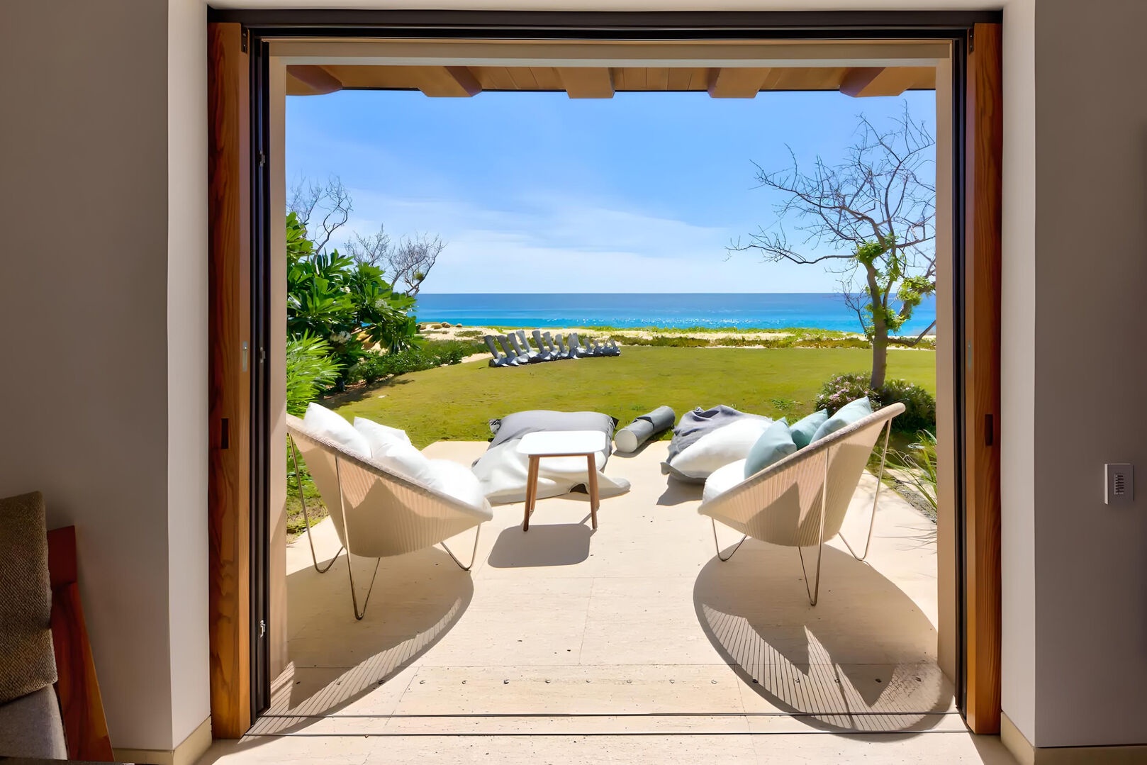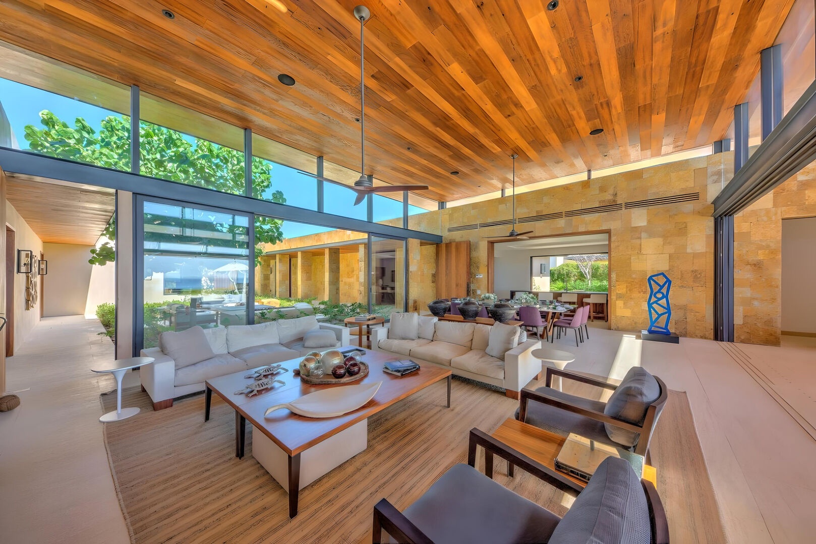 The home is centered around a peaceful courtyard that capitalizes on ocean views, offering guests a serene space to relax. The design of Villa Tau ensures a seamless flow between the outdoor and indoor spaces, creating a harmonious living environment. The interior is inspired by the natural beauty outside, with ocean blue and natural hues complemented by abundant wood finishes that flow throughout each room. High ceilings and natural elements combined with modern touches create a sophisticated yet inviting atmosphere.