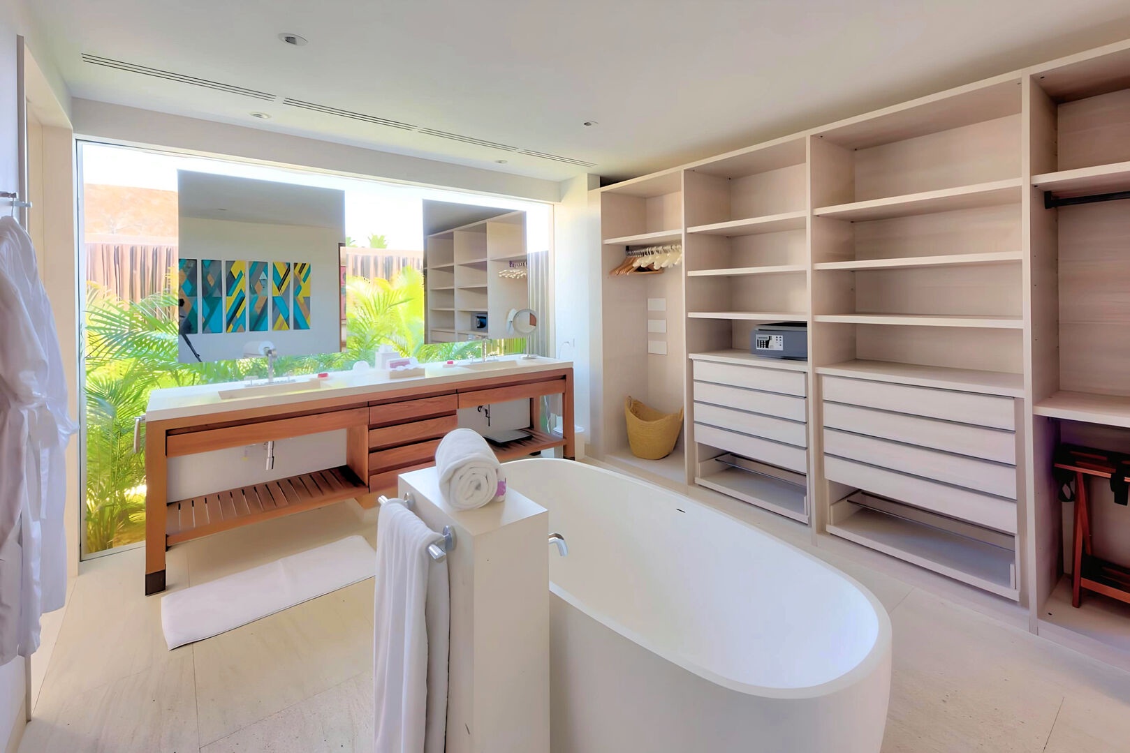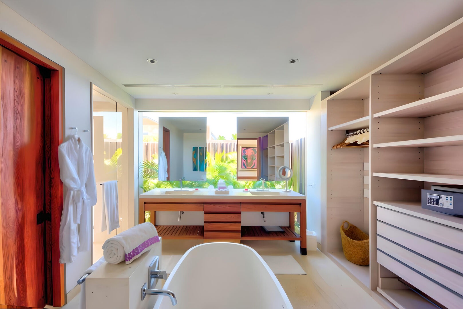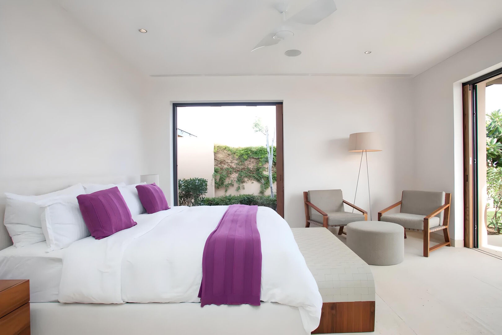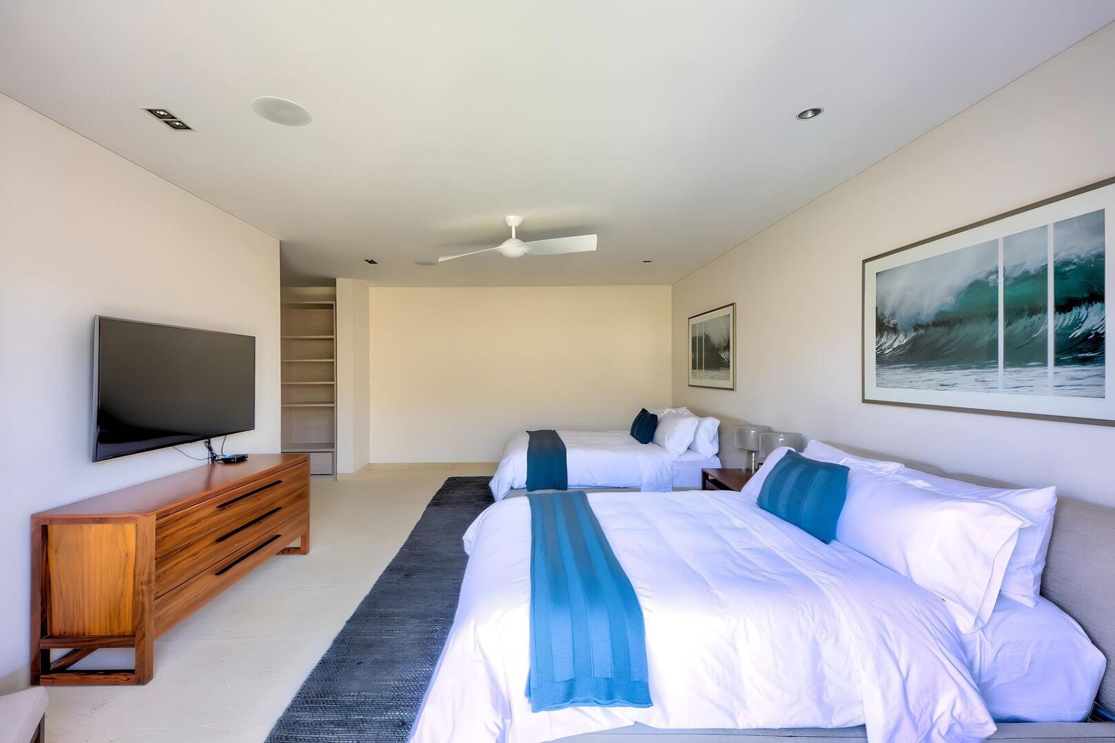 The home is centered around a peaceful courtyard that capitalizes on ocean views, offering guests a serene space to relax. The design of Villa Tau ensures a seamless flow between the outdoor and indoor spaces, creating a harmonious living environment. The interior is inspired by the natural beauty outside, with ocean blue and natural hues complemented by abundant wood finishes that flow throughout each room. High ceilings and natural elements combined with modern touches create a sophisticated yet inviting atmosphere.