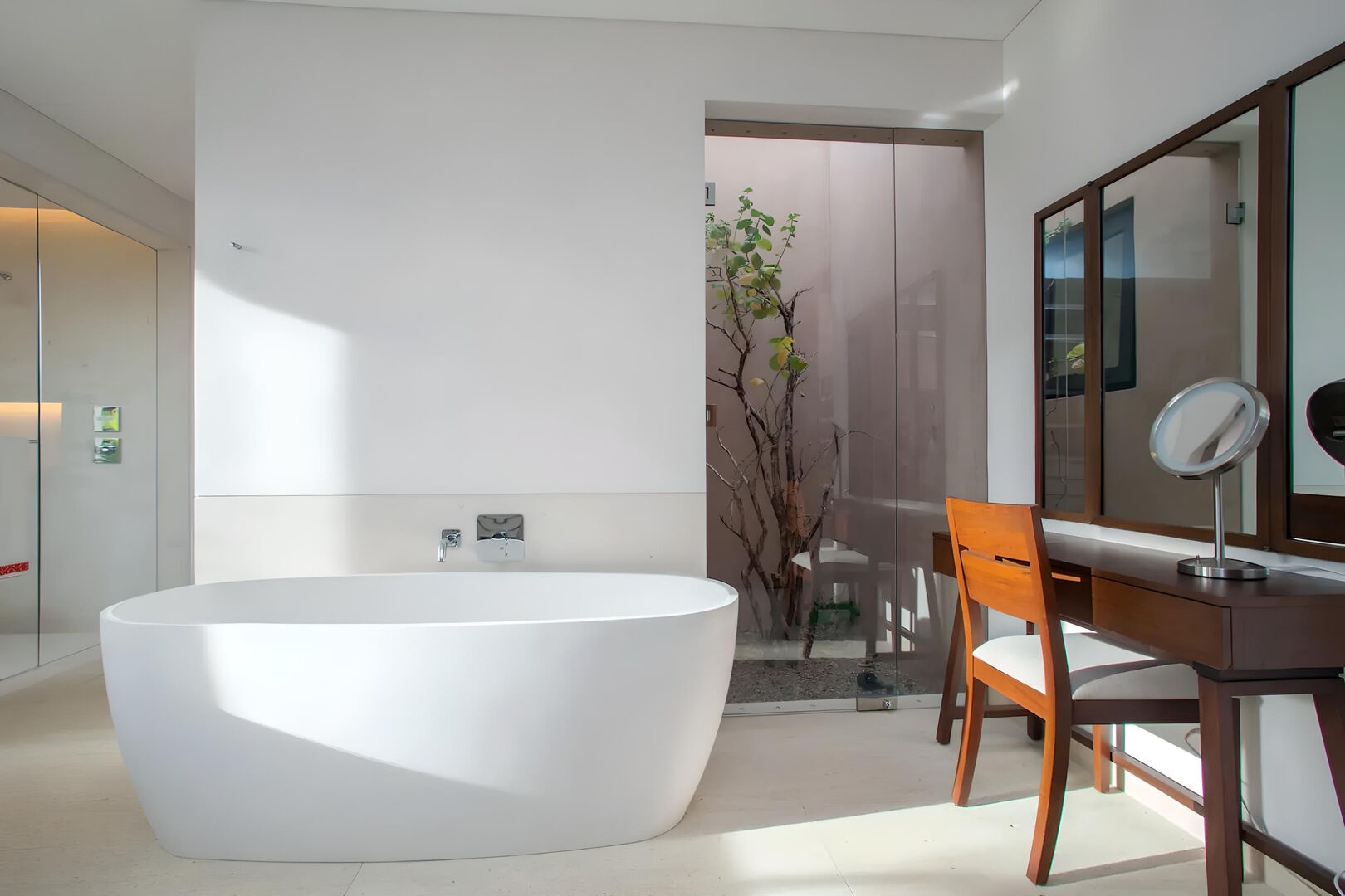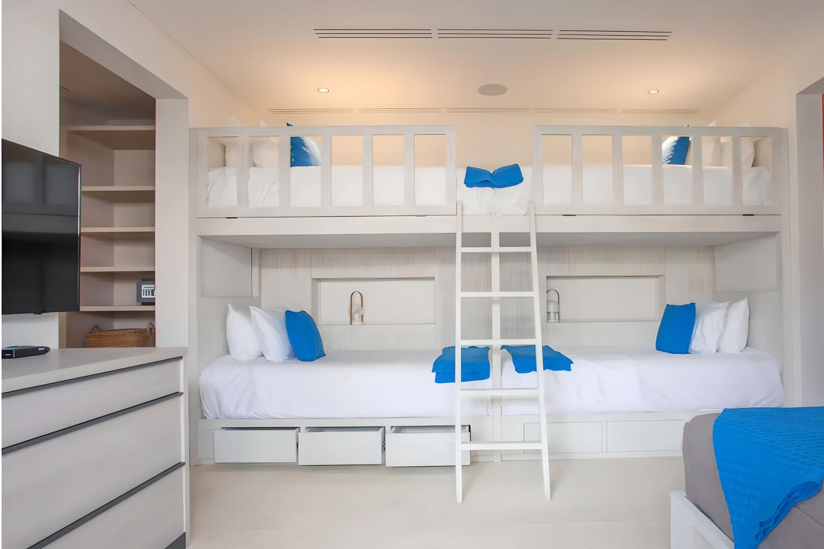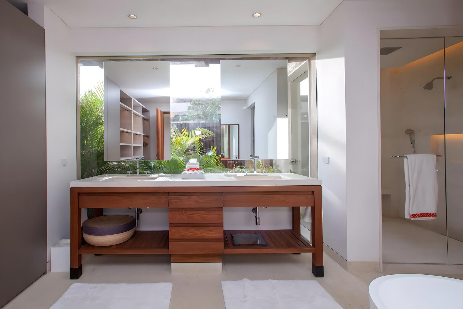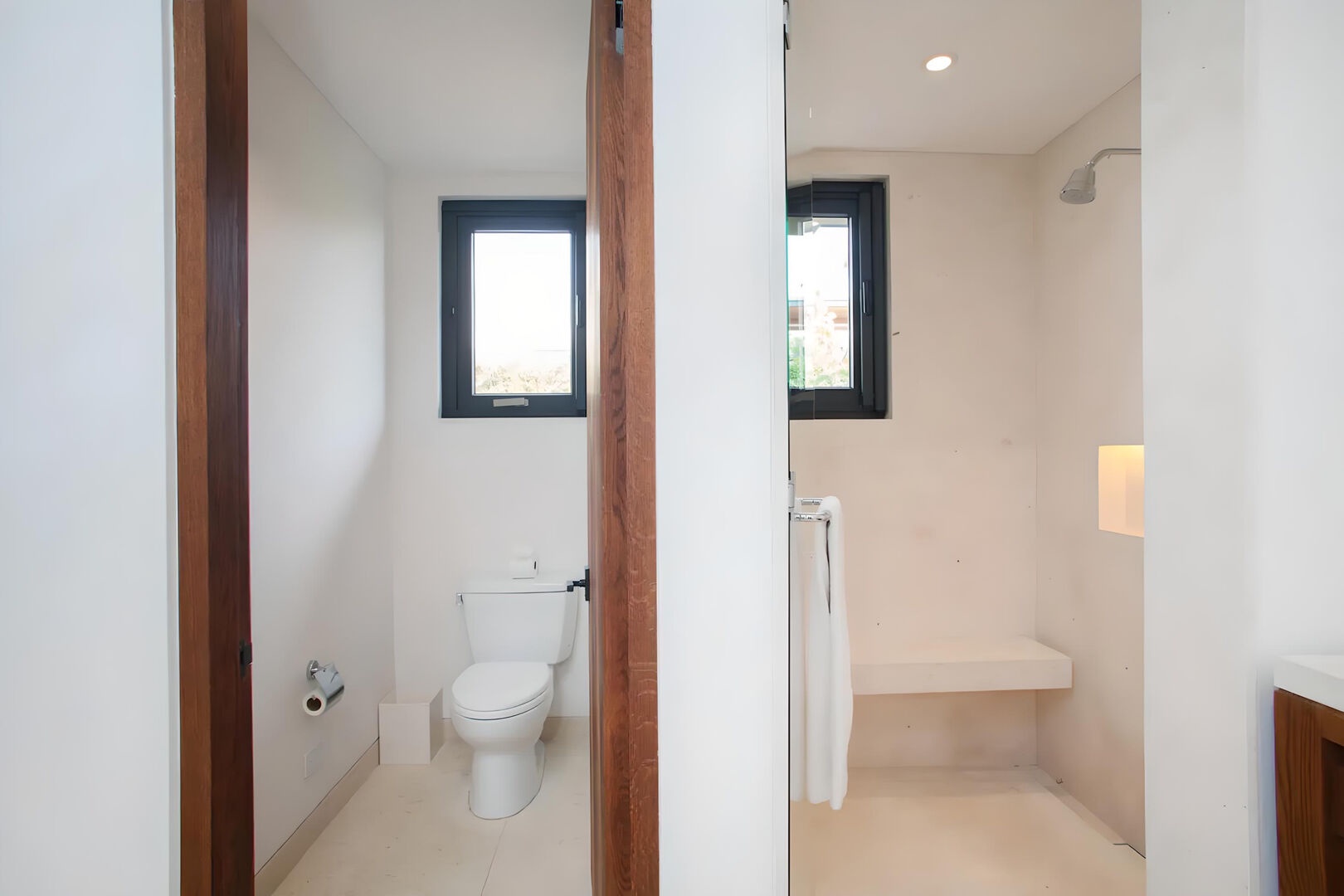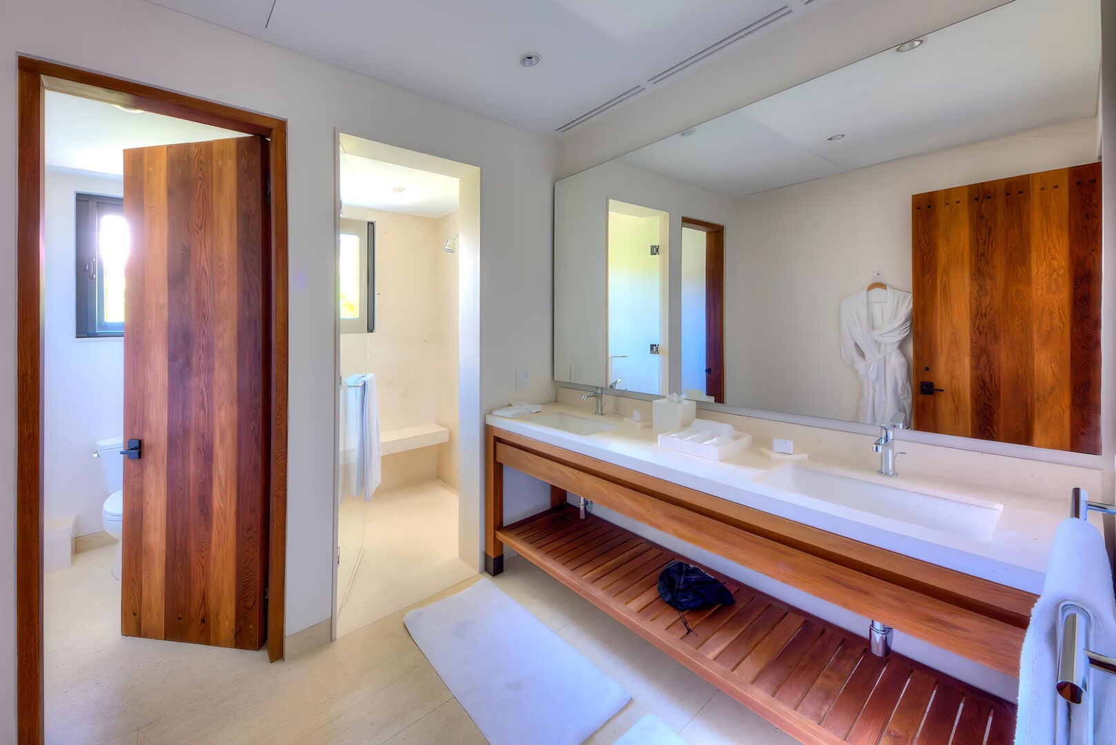 The home is centered around a peaceful courtyard that capitalizes on ocean views, offering guests a serene space to relax. The design of Villa Tau ensures a seamless flow between the outdoor and indoor spaces, creating a harmonious living environment. The interior is inspired by the natural beauty outside, with ocean blue and natural hues complemented by abundant wood finishes that flow throughout each room. High ceilings and natural elements combined with modern touches create a sophisticated yet inviting atmosphere.